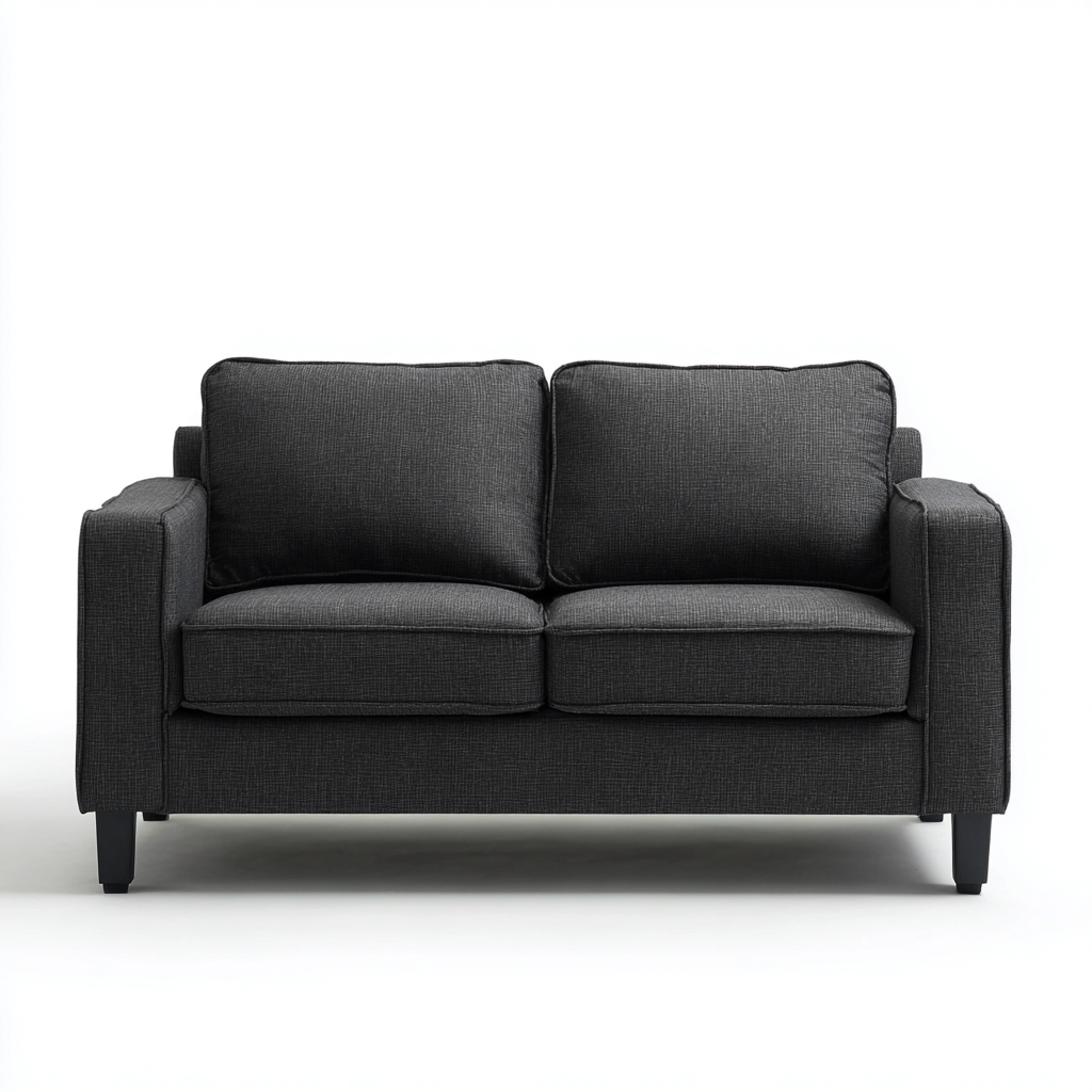 Ce canapé droit en tissu gris foncé présente une silhouette moderne et soignée. Il offre une assise confortable et un format compact, idéal pour aménager un salon contemporain ou un espace restreint.