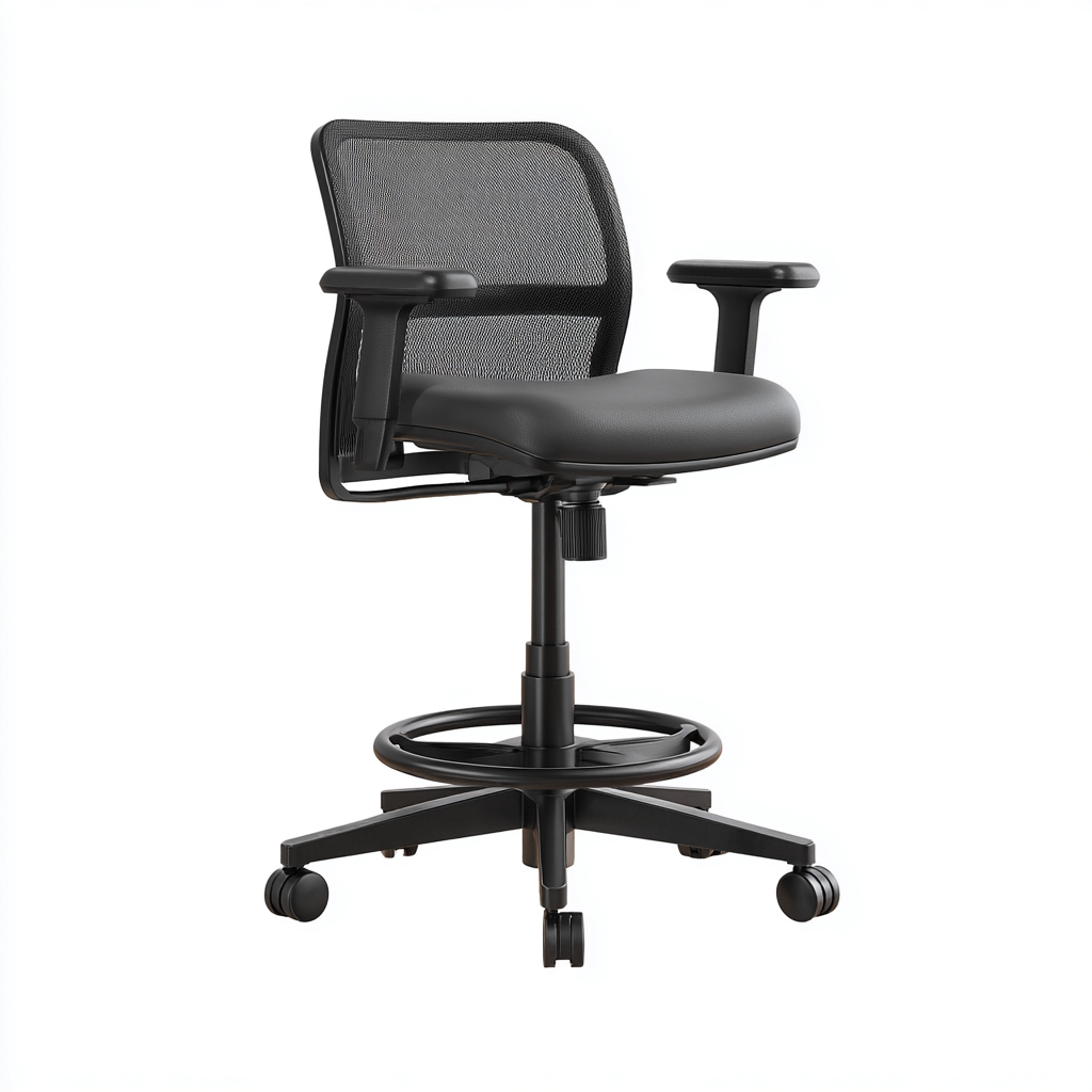 Cette chaise de bureau ergonomique au style moderne est conçue pour un usage prolongé dans un environnement de travail, en particulier pour les postes en hauteur. Son dossier en maille respirante et son assise en simili cuir offrent une assise confortable et aérée.