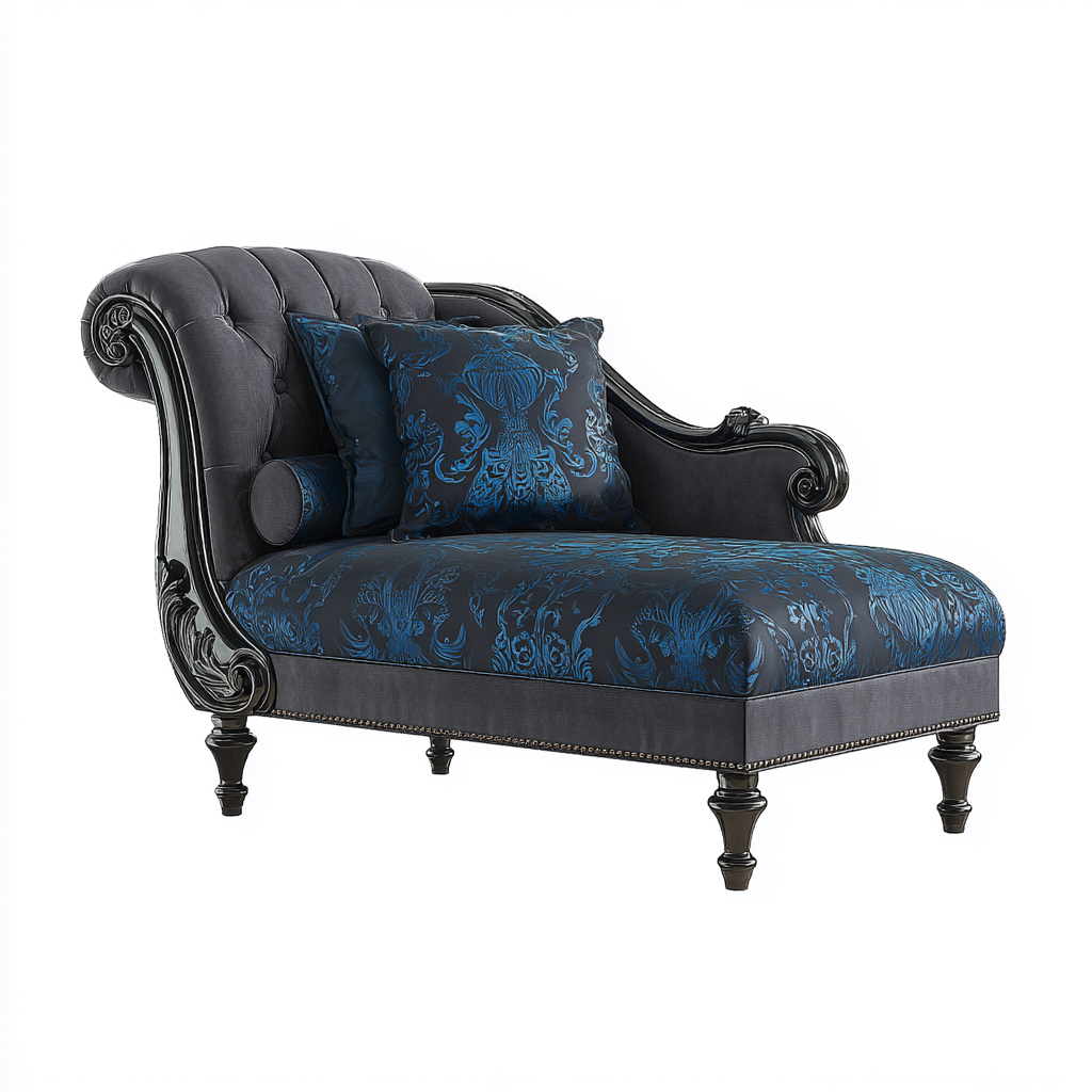 Le revêtement en tissu gris foncé est associé à une surface bleue ornée de motifs décoratifs, donnant un aspect sophistiqué à l'ensemble. La structure et les pieds en bois foncé présentent des détails sculptés qui soulignent le style classique et la qualité de finition.