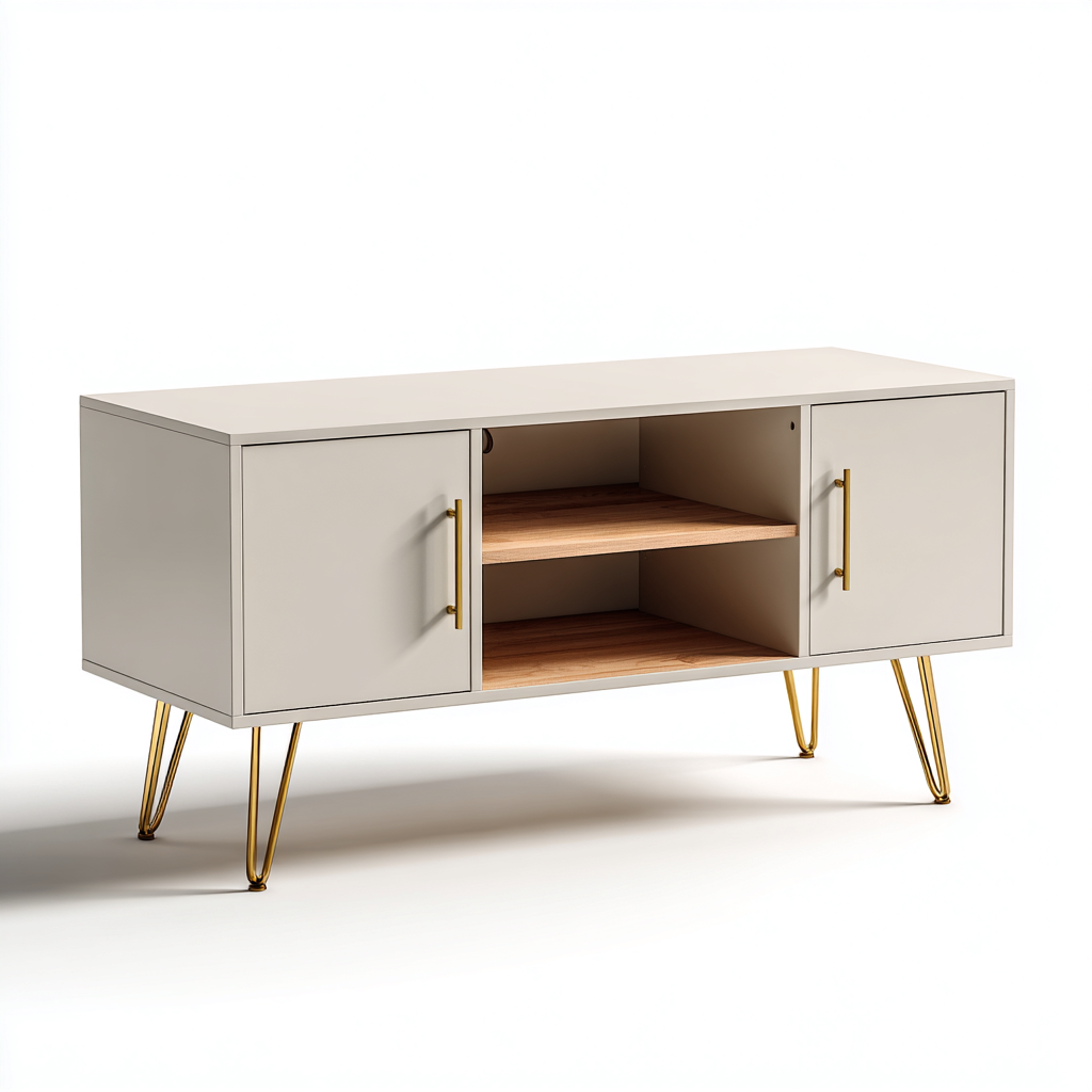 Ce meuble TV moderne arbore une finition beige douce associée à des pieds métalliques dorés, offrant une esthétique élégante et contemporaine pour l'espace multimédia du salon. Sa structure équilibrée et ses lignes épurées permettent une intégration facile dans divers styles d'intérieur.