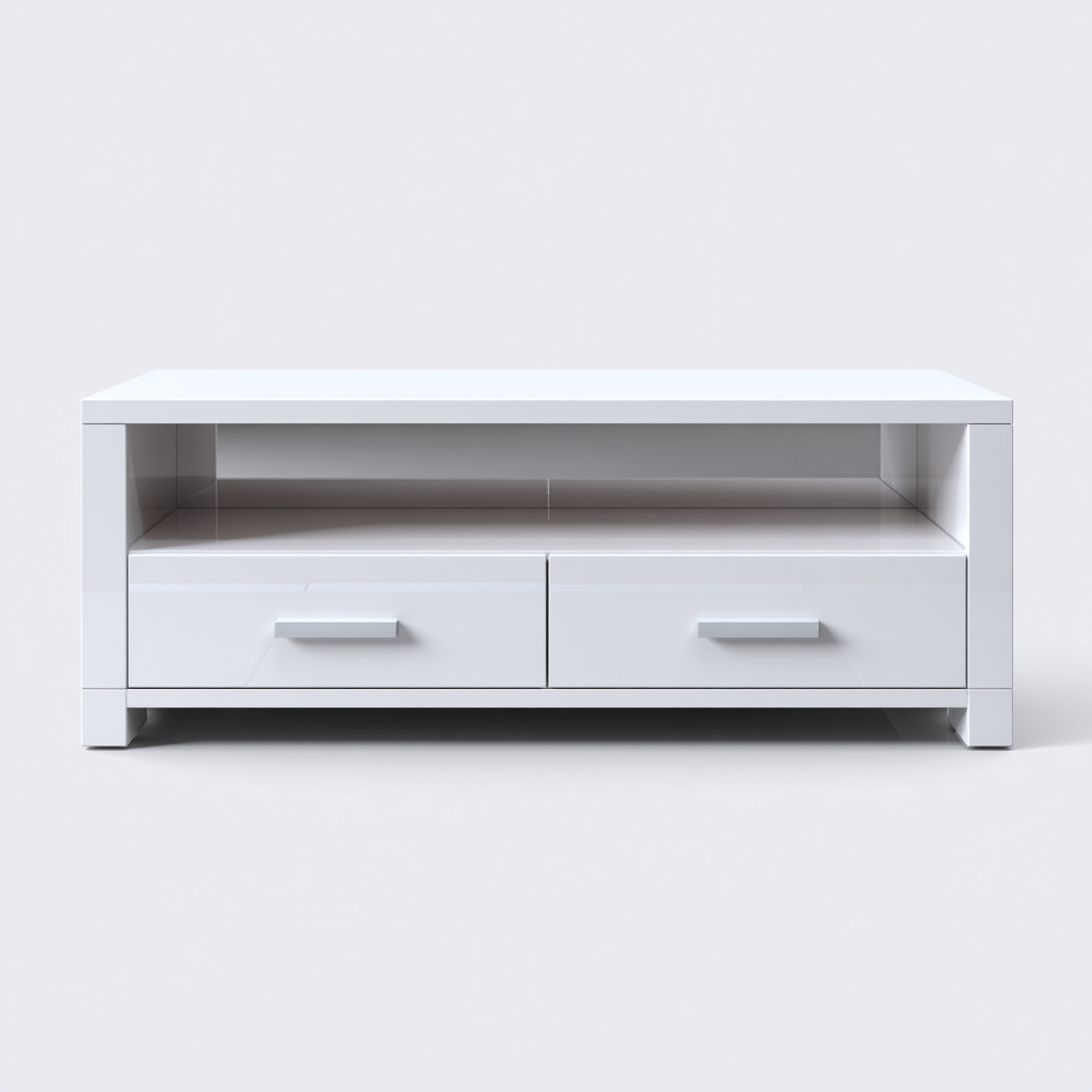 Le meuble est fabriqué en panneaux MDF avec une finition blanche lisse et brillante. La structure solide assure une bonne stabilité, tandis que les poignées discrètes renforcent l'aspect moderne et fonctionnel de l'ensemble.
