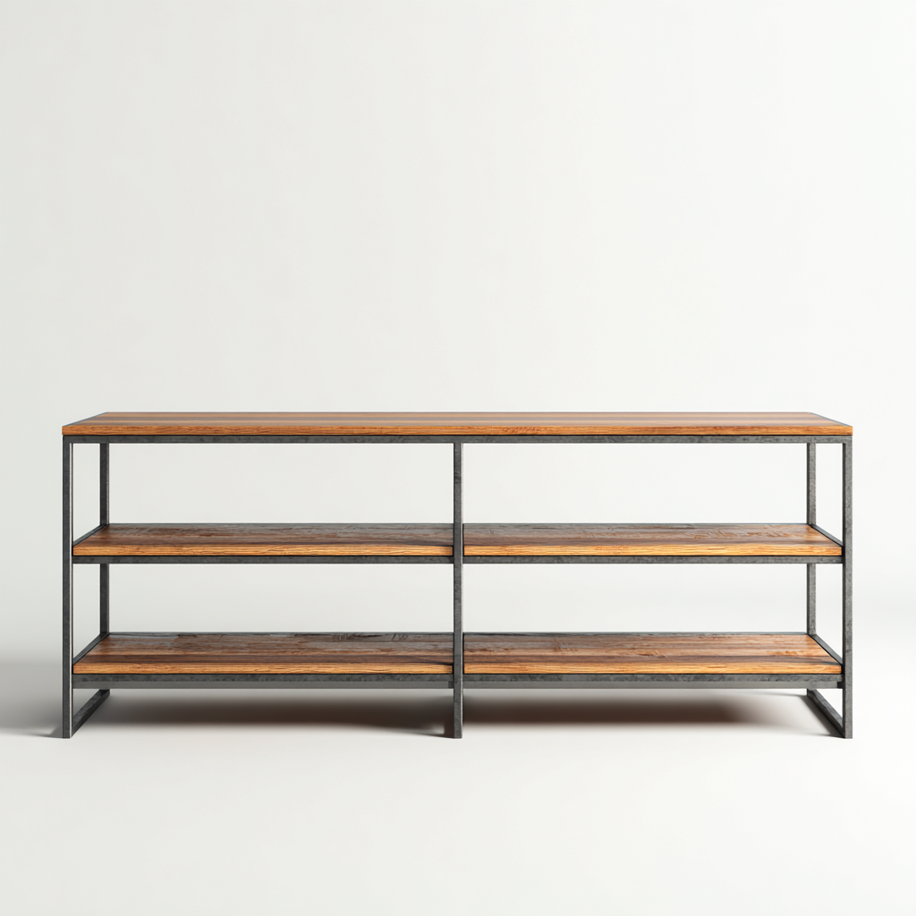 Ce meuble TV au style industriel combine une structure métallique solide avec des plateaux en bois naturel pour offrir un espace fonctionnel et épuré dans le salon. Sa conception ouverte permet de disposer aisément des équipements multimédias et d'optimiser l'organisation de l'espace.