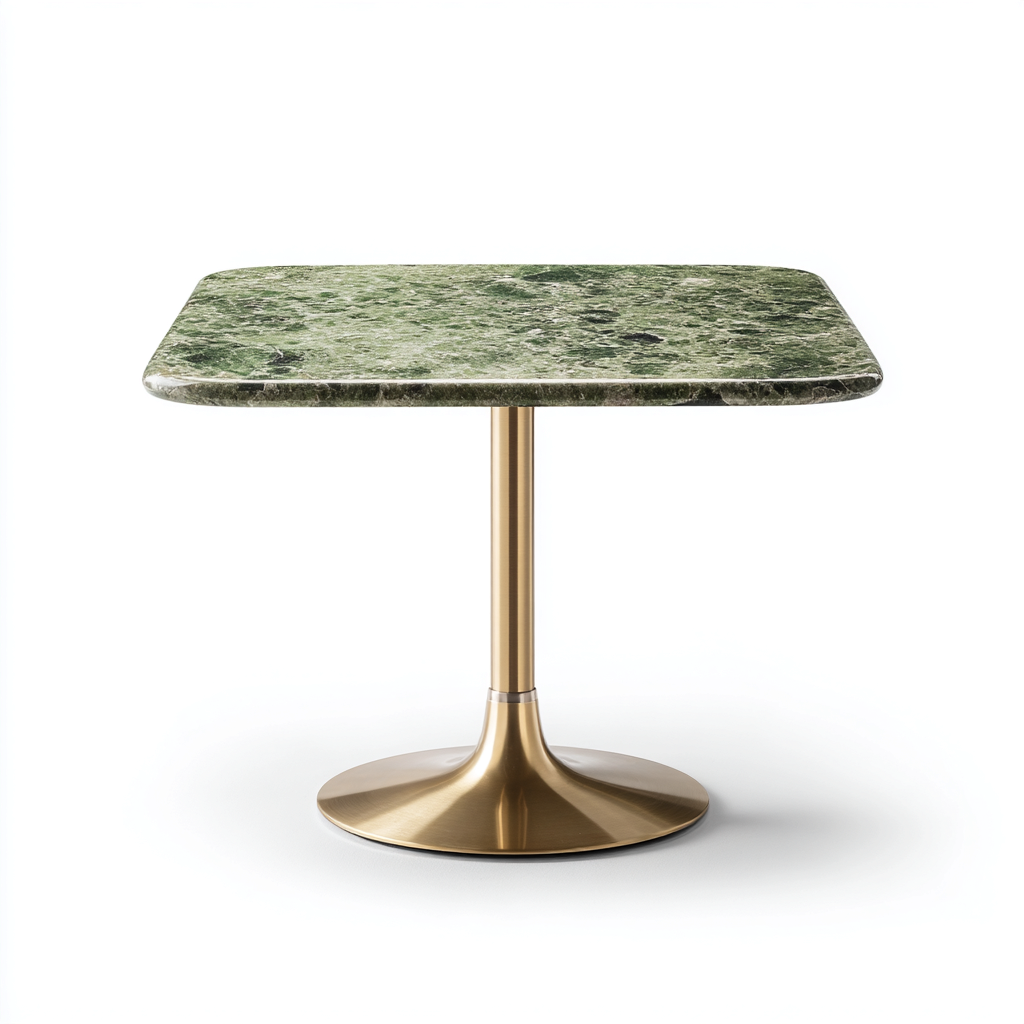 Plateau en marbre vert lisse avec veines naturelles apparentes, base en métal doré assurant stabilité et durabilité.