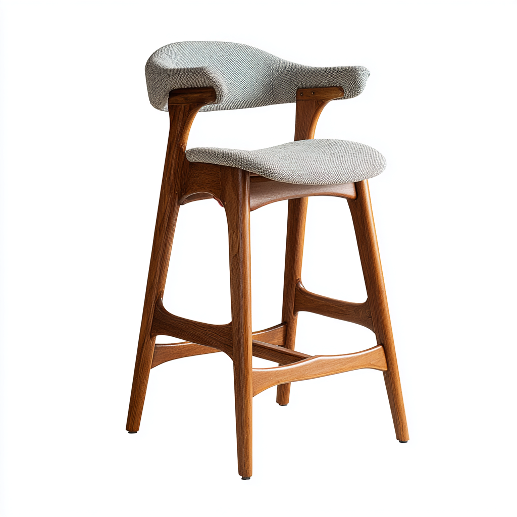 Ce tabouret de bar moderne associe une structure en bois marron à une assise et un dossier en tissu gris clair. Sa silhouette épurée et son confort soigné en font un choix idéal pour une salle à manger ou un comptoir haut.
